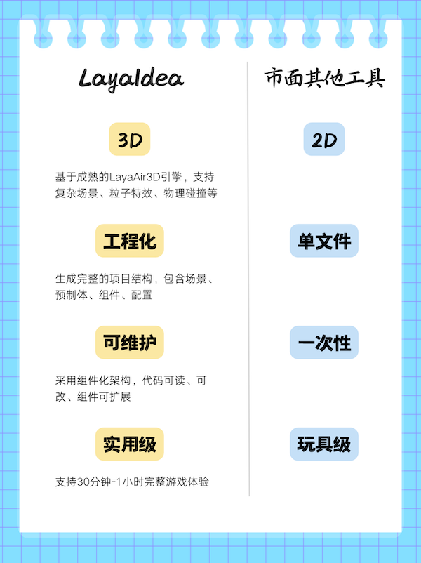 基于LayaAir引擎,LayaIdea构建了一套完整的工业级AIGC开发流程,实现了从策划文档到完整3D游戏项目的自动化生成,与市面现有AIGC工具在技术能力、实用性上形成显著差异,具体对比如下: